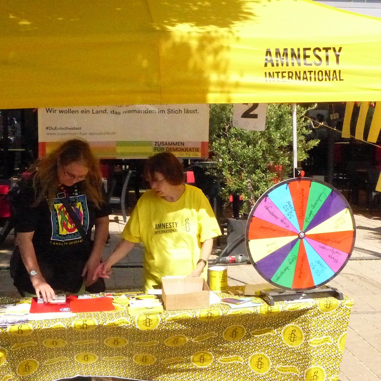 Den größten Zulauf hatte unser SDG Glücksrad (die 17 Ziele für nach-haltige Entwicklung englisch Sustainable Development Goals). Bei Teilnahme gab es faire Preise aus dem Weltladen zur Auswahl. Für das Glücksrad war unser Standort einerseits gut, aber durch die Nähe zur Bühne und die Lautstärke der Musik und Sprachbeiträge war es oft eine Herausforderung.